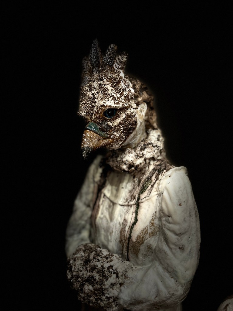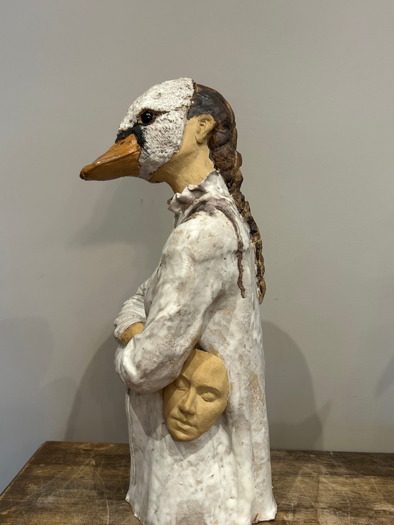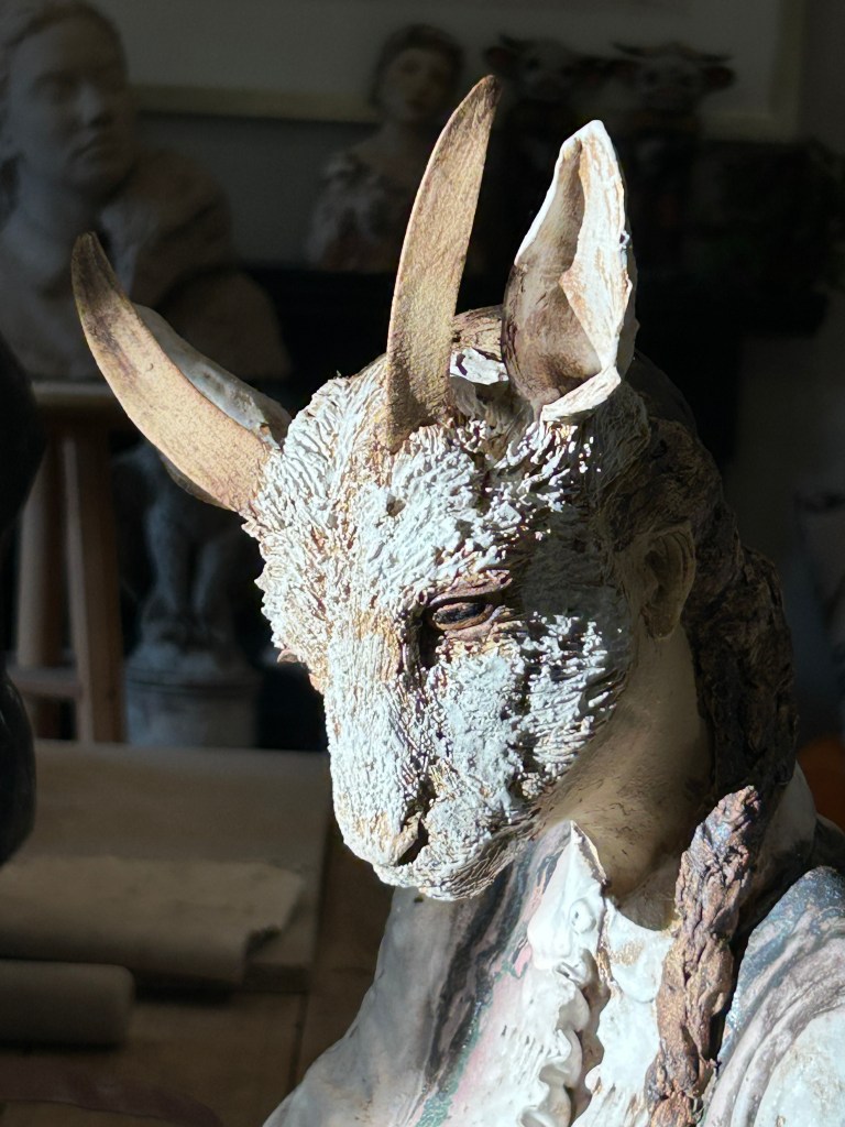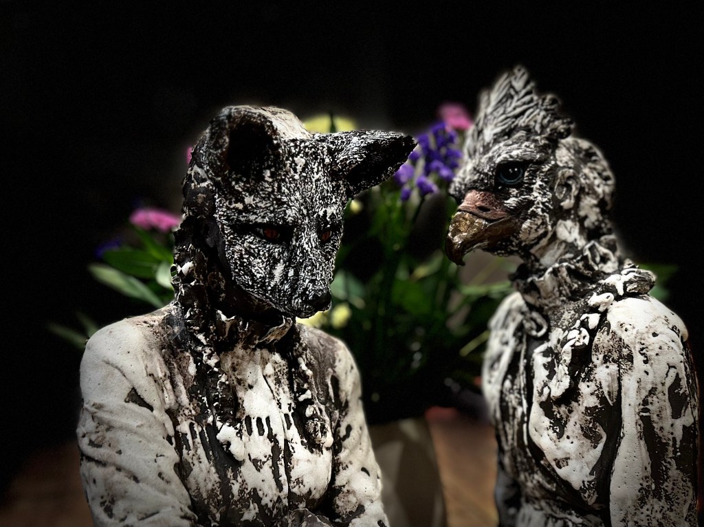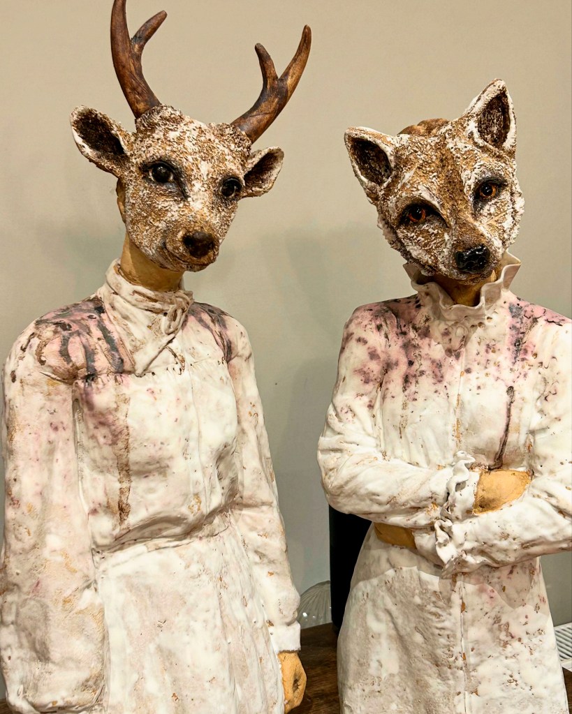 My figures often wear animal masks or are closely entwined with animals, not as decoration, but as companions, or extensions of the self. This closeness invites questions about identity, instinct, and transformation. I work with texture, gesture, and surface to evoke a sense of time and emotion, each piece carrying its own quiet story, as though unearthed from a forgotten fable.
