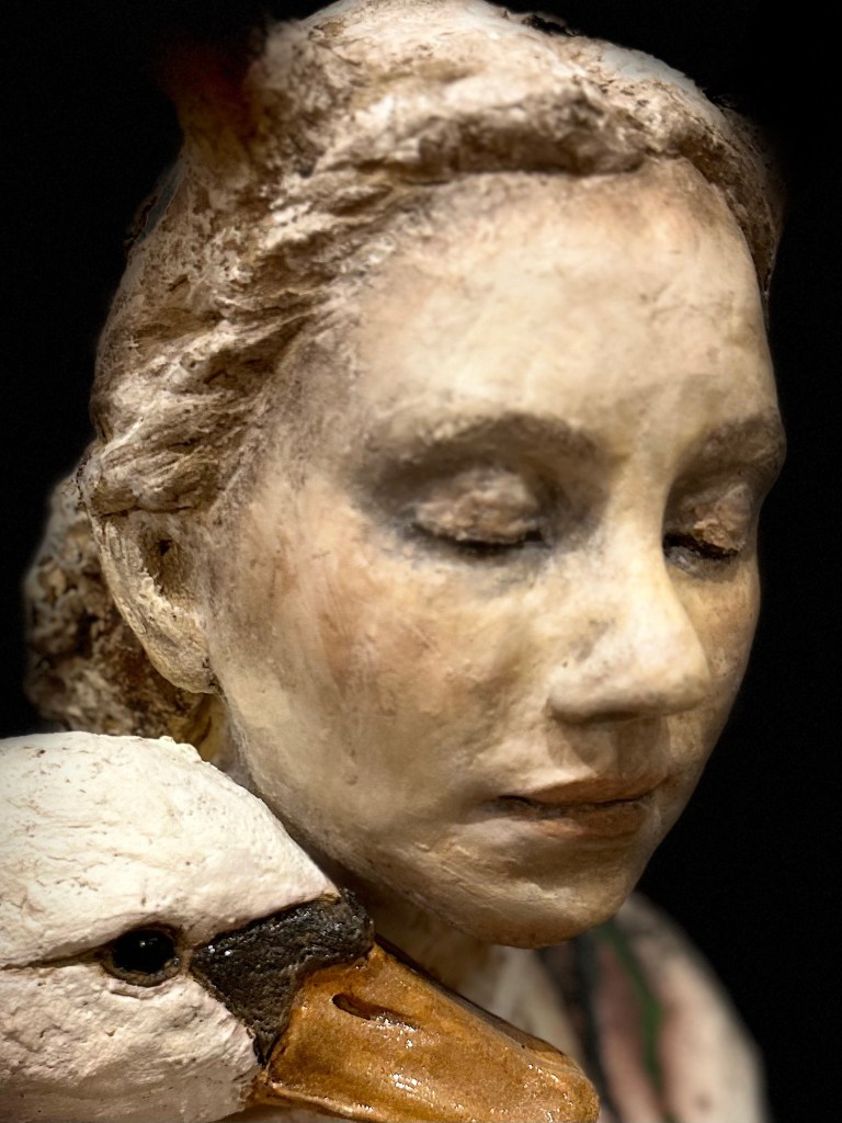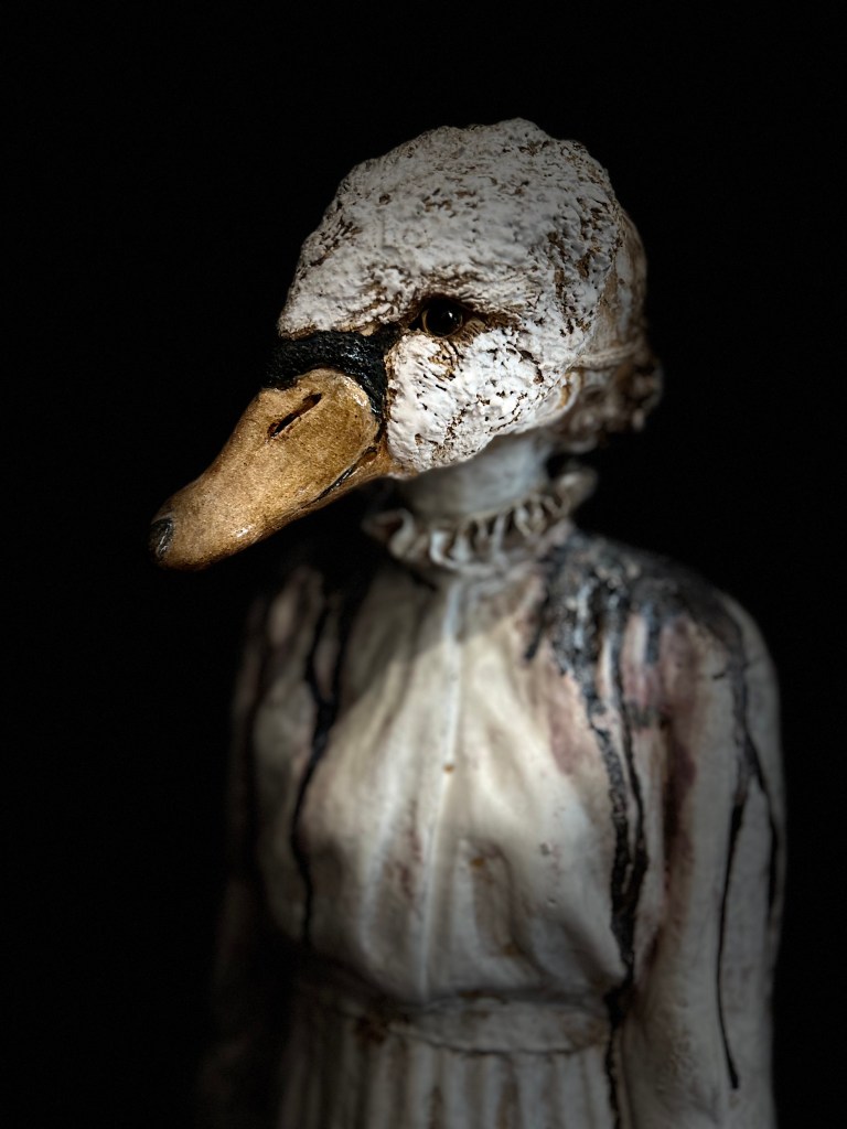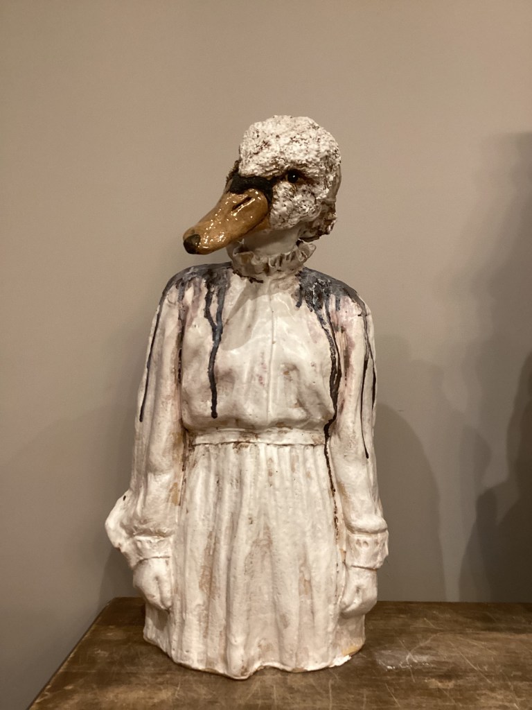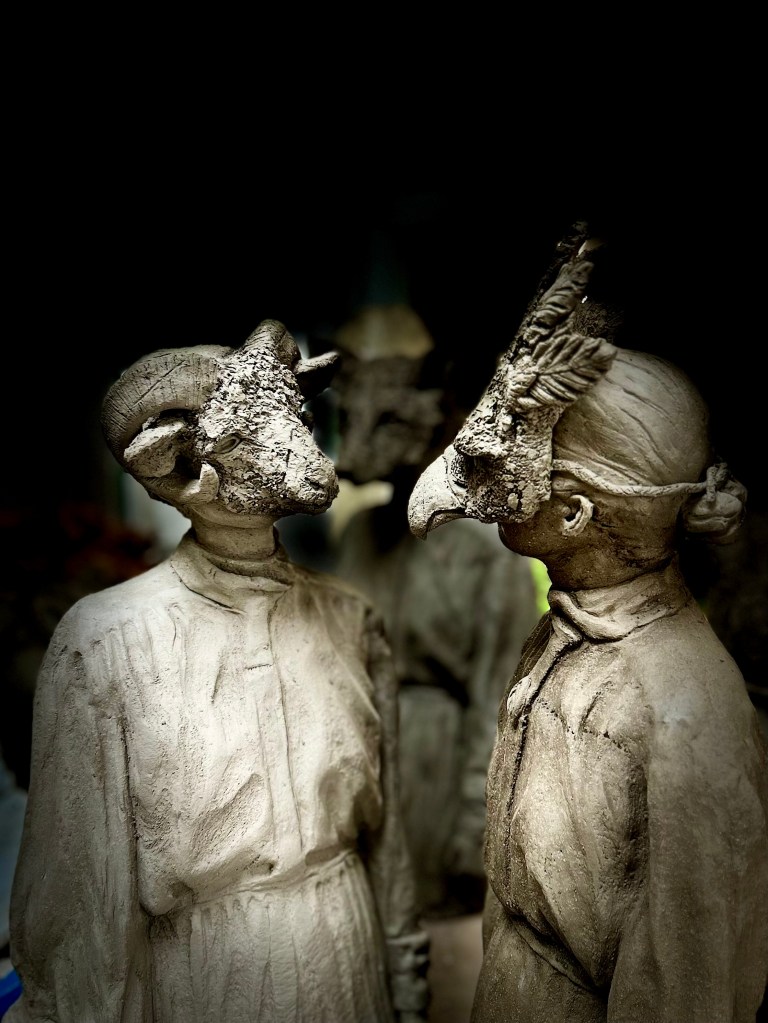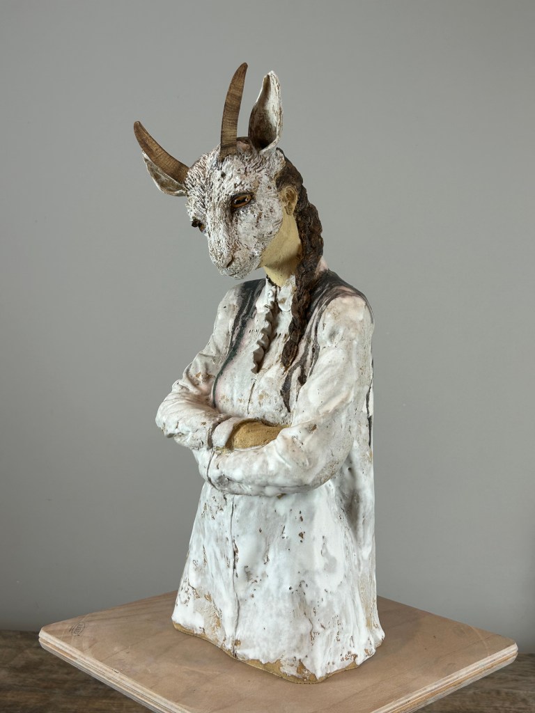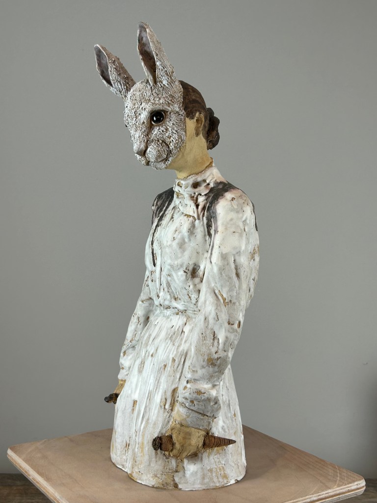 My figures often wear animal masks or are closely entwined with animals, not as decoration, but as companions, or extensions of the self. This closeness invites questions about identity, instinct, and transformation. I work with texture, gesture, and surface to evoke a sense of time and emotion, each piece carrying its own quiet story, as though unearthed from a forgotten fable.